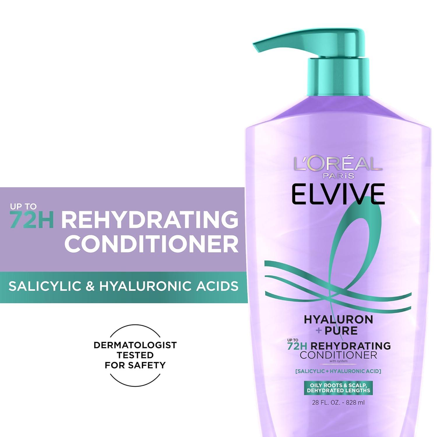 Rehydrating Conditioner for Oily Roots and Dehydrated Lengths: Elvive Hyaluron + Pure features a dual-action formula with Salicylic Acid and Hyaluronic Acid to instantly restore moisture leaving the lengths hydrated and airy for up to 72H