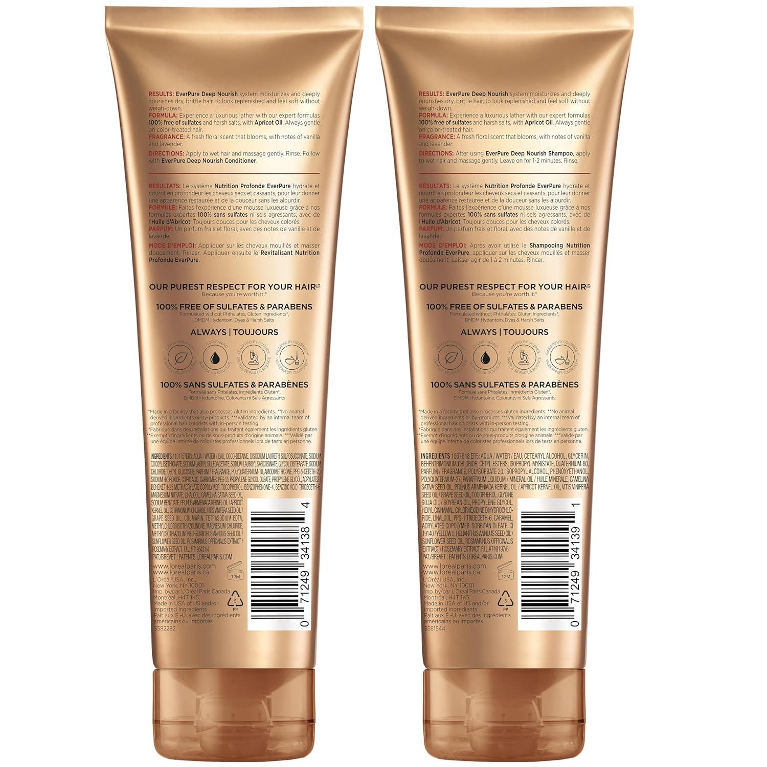 L’Oréal Paris EverPure Deep Nourish Sulfate Free Shampoo and Conditioner moisturizes and nourishes dry hair for silky-soft texture and healthy shine while being lightweight. Hydrating Apricot oil deeply conditions and smooths, leaving hair looking healthier after the 1st use. Our formulas are especially gentle on color treated hair. There are no harsh sulfates, salts or surfactants that can strip, dull and damage hair. Experience a purely sensorial lush, luxurious lather and a fresh aromatic fragrance that blooms. L’Oréal Paris is a total beauty care company that combines the latest in technology with the highest in quality for the ultimate in hair color, hair care, hair style, skin care and cosmetics.